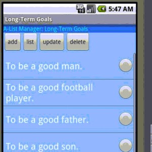 The idea of this app comes from former US President Clinton's autobiography, My Life. He stated in his book: [When I was a young man just out of law school and eager to get on with my life, on a whim I briefly put aside my reading preference for fiction and history and bought one of those how-to books: How to Get Control of Your Time and Your Life, by Alan Lakein.] This is a database application implements the idea of A-List mentioned in President Clinton's book, My Life. Since it's a database application using SQLite, it's highly relied on file systems on Android. If you encounter problem(s), it mostly comes from the database file used in this application. So, please remember to back up your database to an external SD card. This program is based on a successful US President's story. Just the Long-term AList is a very helpful tool for everyone's life. One needs to have some goals in mind, then fulfill the goals. If you like the program and find a problem, please email me the problem (and steps to reproduce it); otherwise, please do me a favor - don't just post an error log. Your co-operation is appreciated. Since SQLite is only a one-file database, it can not be large, and should not be large. Also, even users could "touch" this file, it might be corrupted by misuse or accidents. If you encounter any problem, please do NOT get "panic", just to restore your backup back to the application. This program can NOT load your database if you uninstall the program and re-install it. If this happens, just remember to restore your backup. SORRY. No progress on this app. The major reason to present this app is to introduce President Clinton's way in success and his kindness to share his ideas with young people. YPK software's major interest is in Math (games) development. If there are enough interests (users) and requests (demands) from Android users, then YPK software might consider further development of this little app. BUT, this does not exclude the possibility for new development. Once again, several major long-term alists might change your life dramatically. Cheers and have fun!What's new in AList 1.3